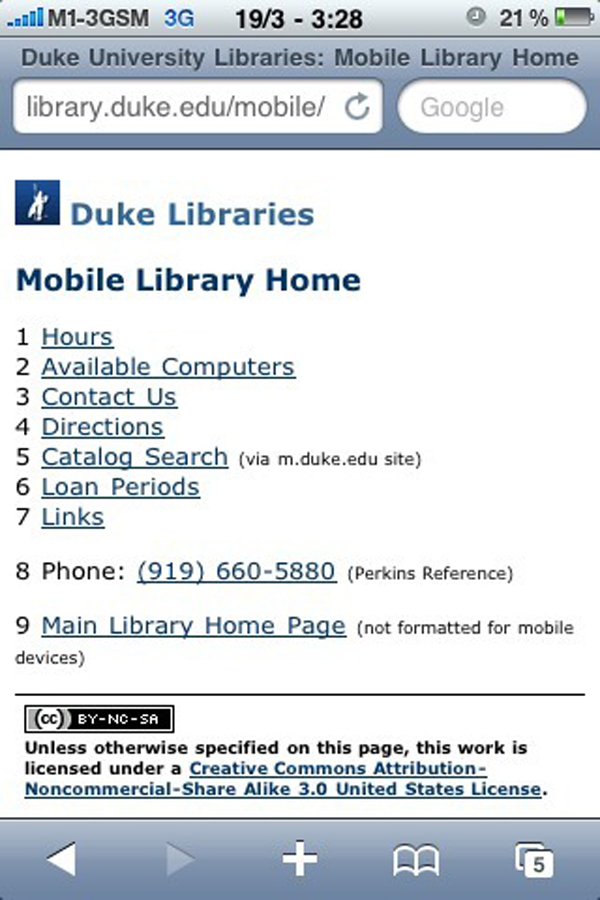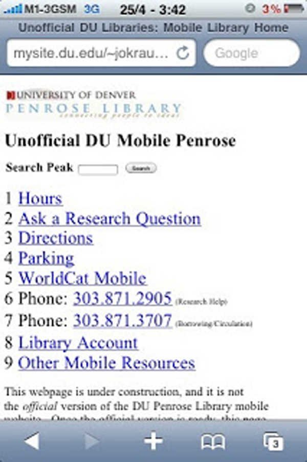 Mobile library websites with a bare-bones text layout in 2010—Duke University Libraries* and University of Denver Penrose Library* |
