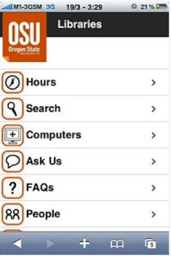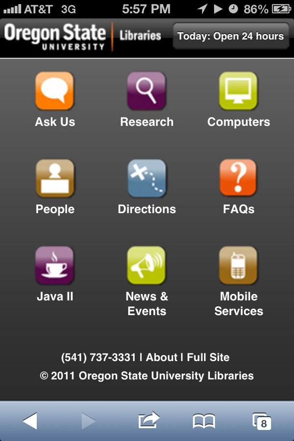 The “Mobile Services” page includes the BeaverTrack History Tour and Book Genie, both of which are web apps developed by OSU Libraries. As a side note, it is interesting to see that the OSU Libraries’ mobile website redesign went in exactly the opposite direction from NCSU’s in terms of the layout. While the NCSU Libraries mobile website moved from the icon-style layout to the list-style layout, the OSU Libraries mobile website changed from the list-style layout to the icon-style layout.