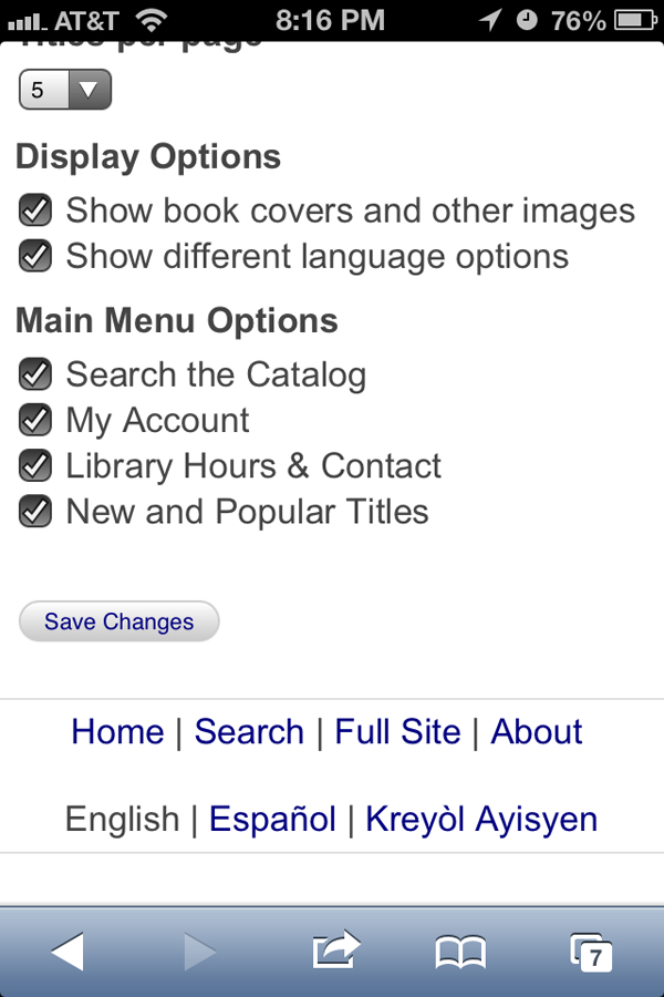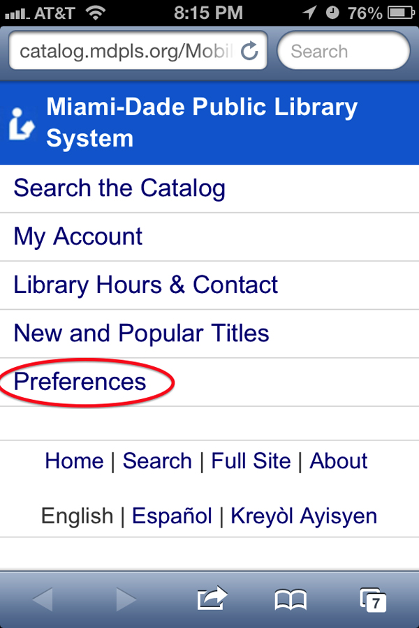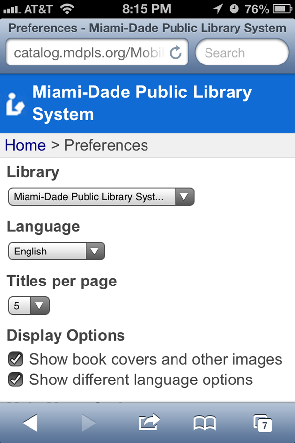 Miami Dade Public Library’s mobile website [http://catalog.mdpls.org/mobile] allows a patron to set preferences. |
