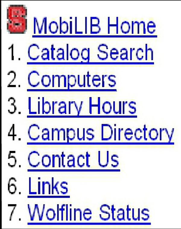 NCSU Libraries’ mobile website MobiLIB in 2007 [Image credit: Markus Wust, “MobiLIB: A Library Service for Generation ‘Mobile’ at North Carolina State University” (presented at the RUSA MARS Hot Topics Discussion Group at American Library Association Annual Meeting, Washington, DC, June 23, 2007), www.lib.ncsu.edu/documents/dli/projects/mobilib/Presentation_ALA.ppt] |