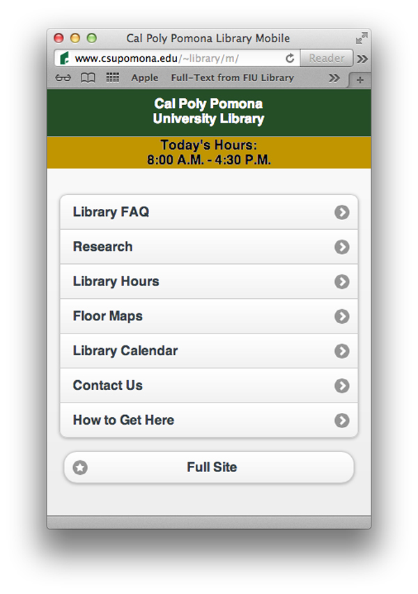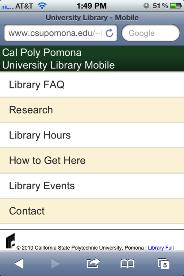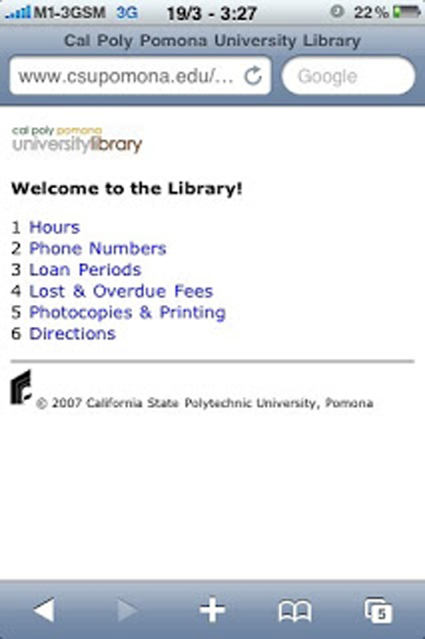In 2010, the Cal Poly Pomona University Library mobile website featured hours, phone numbers, loan periods, overdue fees, photocopies and printing, and directions in a bare-bones text layout typical of mobile websites designed to support the feature phone. In 2012, the layout was changed to the list style more suitable for the smartphone. Although the names of the menu items changed, the content is not much different (see figure 3.6).