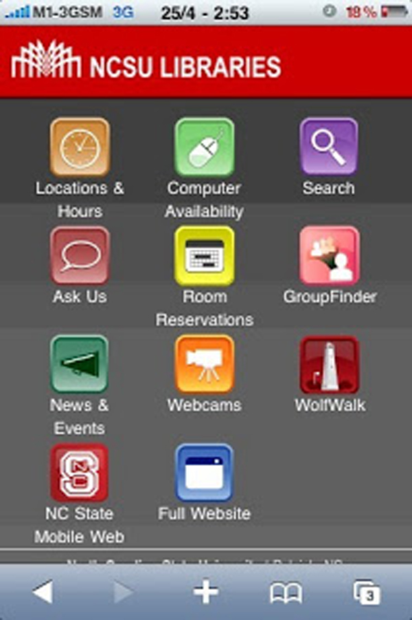 North Carolina State University (NCSU) Libraries (see figure 3.10) initially created MobiLIB, a mobile website optimized for the feature phone, in 2007.7 In November 2009, the libraries redesigned the mobile website for smartphone users. This mobile website was seen as one of the most sophisticated mobile library websites at the time.8 It offered information about library hours, catalog search, news, and computer availability and even showed real-time video feeds from a few webcams installed at the library building. In 2010, more features, including the group finder, room reservation, and a historical guide to the NCSU campus landmarks named WolfWalk, were added. In 2012, the mobile site was redesigned again. The number of menu items increased, and perhaps for that reason, the layout changed from the icon style to the list style.