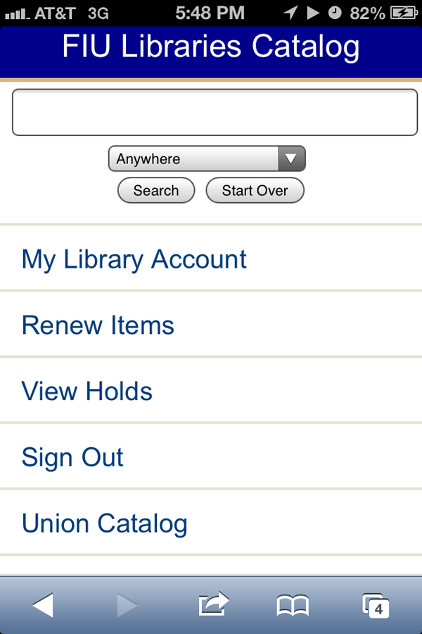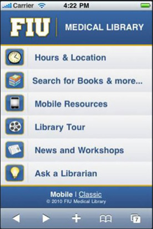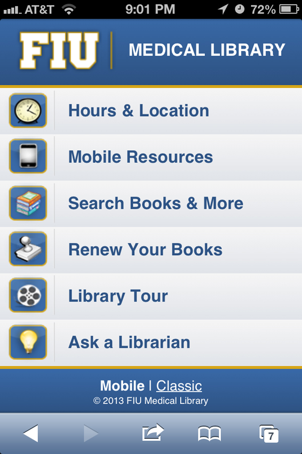 Florida International University Medical Library mobile website in 2010, 2012/2013 [http://medlib.fiu.edu/m], and the new “Renew Your Books” feature that allows the library account management on mobile |