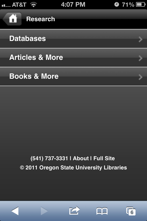 The Oregon State University (OSU) Libraries mobile website also shows a similar trend of placing the library collection and research as primary items on the library mobile website home page. The redesigned mobile website presents “Ask Us” and “Research” on the top row of icons on the mobile home page (see figure 3.13). In the previous version, the “Search” feature was placed below “Hours”. The “Research” link in the new version provides a mobile device user with a mobile-friendly search feature for databases, articles, and books. The “Databases” page provides a list of mobile-friendly research databases; “Articles & More” enables a patron to search across books, journals, and articles through the commercial discovery layer tool Summon; “Books & More” offers the OSU Libraries online catalog search feature for mobile device users.
