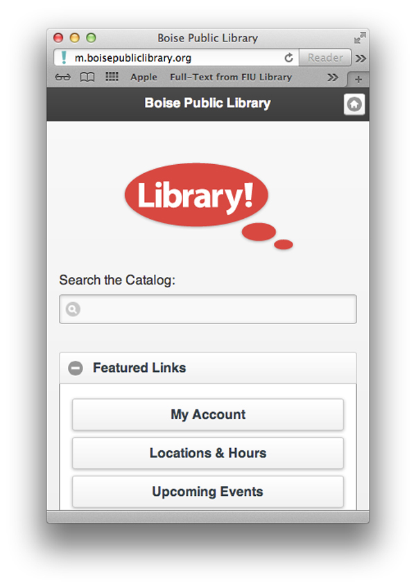The library catalog search box is now seen in other mobile library website home pages, too. Virginia Commonwealth University (VCU) Libraries, Wayne State University (WSU) Libraries, and Boise Public Library all display a catalog search box right in their mobile website home pages (see figure 3.9). The Boise Public Library mobile website features the catalog search box in the center of its home page. Its minimalistic mobile home page also includes three more items, which can be hidden by tapping: “My Account,” “Location & Hours”, and “Upcoming Events.”