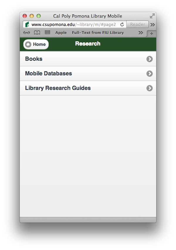 The addition of the Research section is the greatest change in the Cal Poly Pomona University Library mobile site in the last three years. In 2013, the library hours information was moved to the header area, and the “Floor Maps” page was added, but the “Research” section stayed.