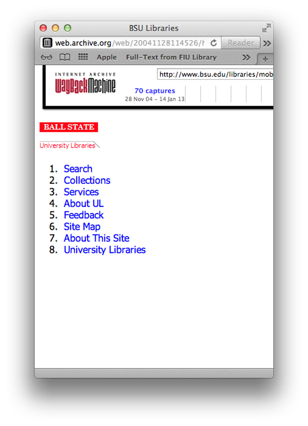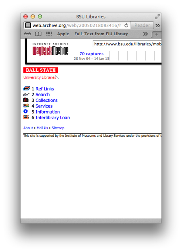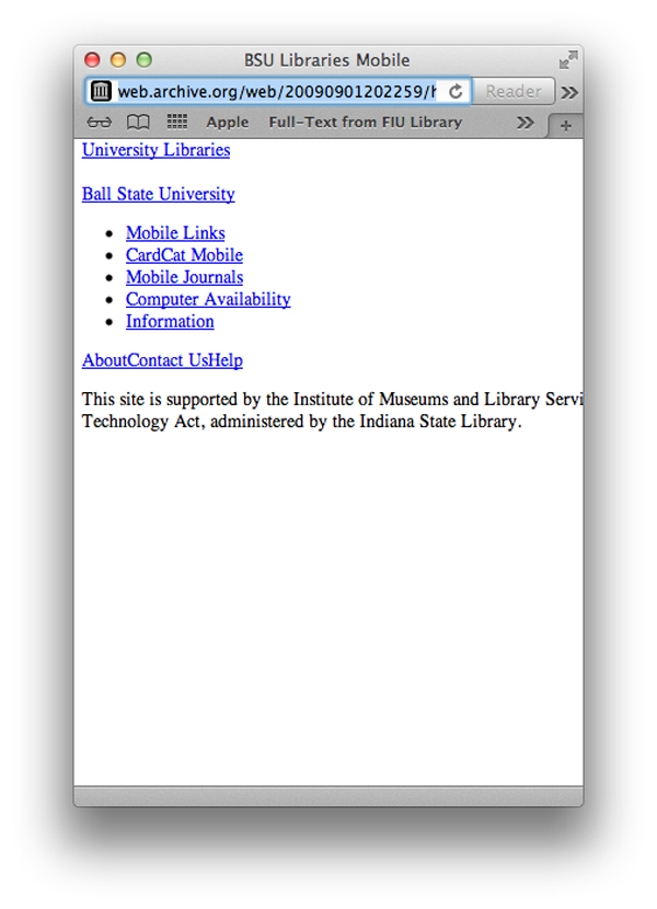 | 3. | Ball State University Libraries, “About UL Mobile, ” December 1, 2004, Internet Archive Wayback Machine, accessed June 10, 2013, http://web.archive.org/web/20041201152656/http://www.bsu.edu/libraries/mobile/about.html |