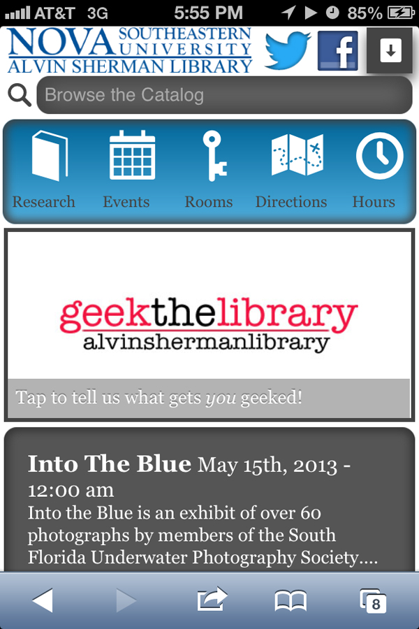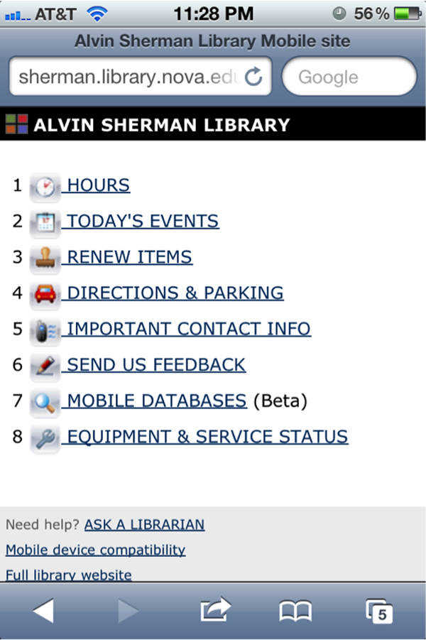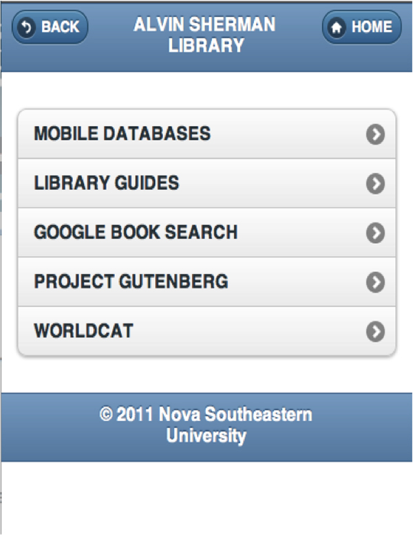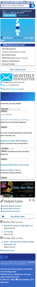 Nova Southeastern University Alvin Sherman Library mobile website in 2010, 2012 (home page and Research Links), and 2013 [http://sherman.library.nova.edu/m] |