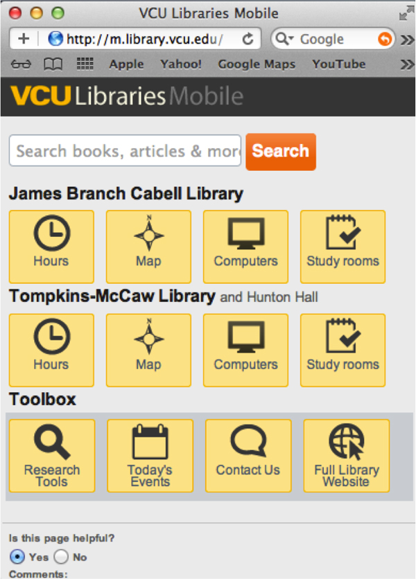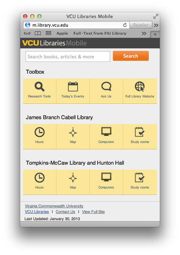 The appearance of the library catalog search box in the mobile library website home page is interesting because it signals more similarity than difference between the library’s desktop website home page and mobile website home page. Also note that the VCU Libraries mobile website changed the order of the rows of icons between 2012 and 2013. In 2012, James Branch Cabell Library with “Hours,” “Map,” “Computers,” and “Study Rooms” information was the first row under the search box. But the “Toolbox” row, which includes “Research Tools,” moved to the top under the search box in 2013.