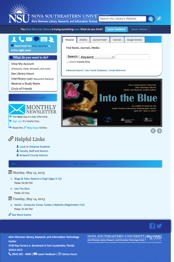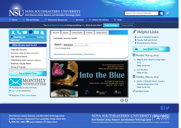 Nova Southeastern University Alvin Sherman Library website [www.nova.edu/library/main] on the screens of three different sizes |