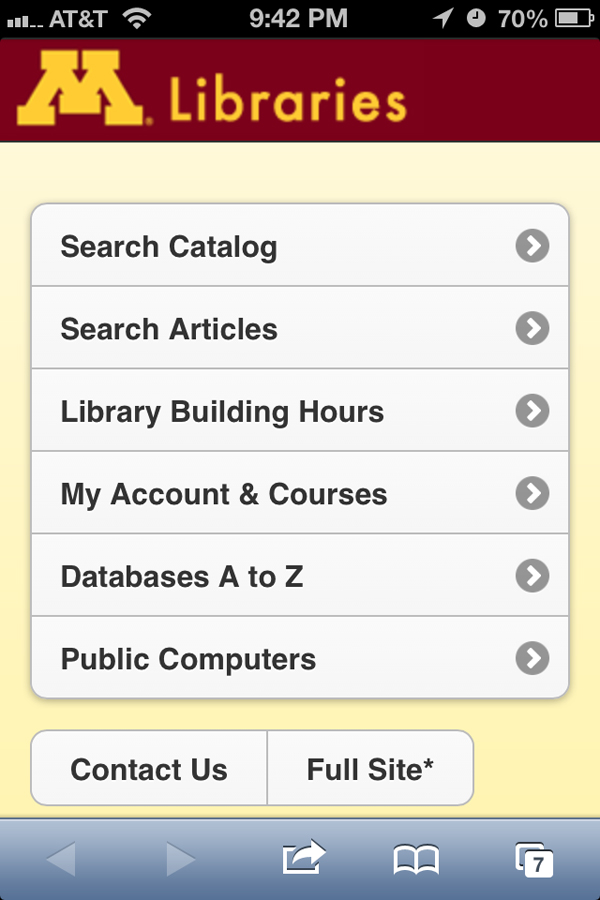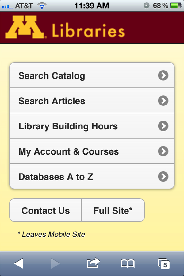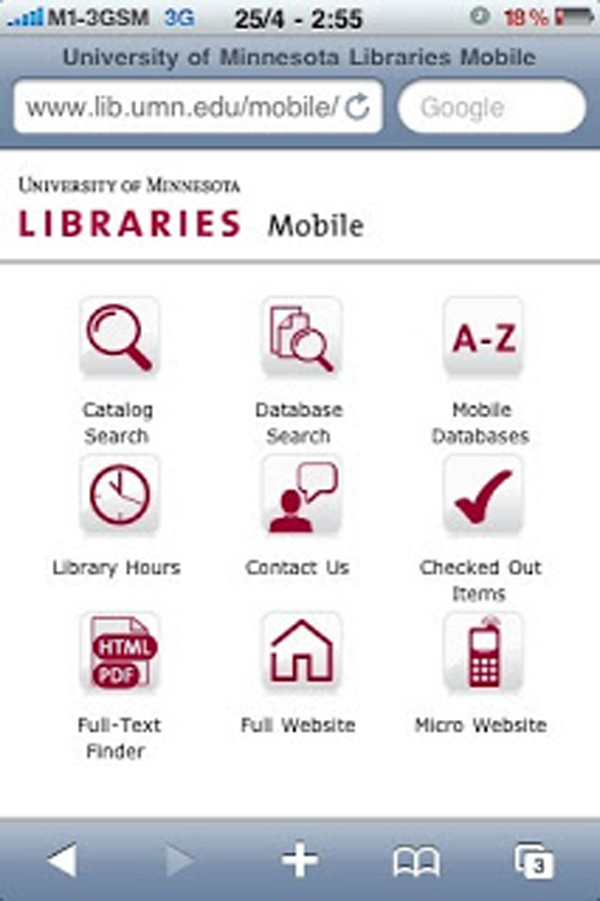 UMN Libraries mobile website in 2010*, 2012, and 2013 [https://www.lib.umn.edu/mobile] |