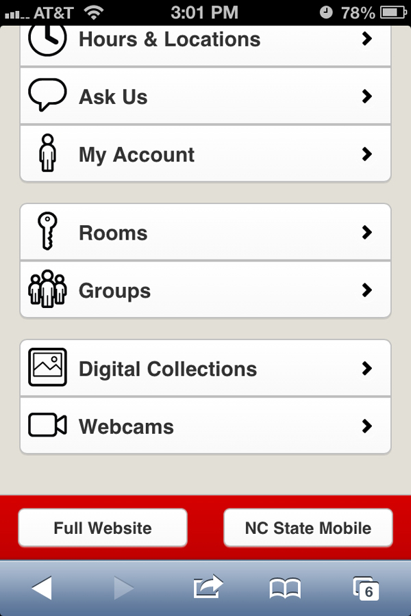 It is interesting to see that the menu item “Hours & Locations”, which used to appear on top in the previous version, has been moved down in the new mobile website. The new NCSU Libraries mobile website also shows two new items—“My Account” and “Digital Collections”—on the mobile home page menu. The “Digital Collections” page includes the library’s six web apps: Student Leadership Initiative, a video collection; Rare & Unique Collections; My #HuntLibrary, a photo contest in the popular mobile app Instagram; WolfWalk, a location-based historical campus tour; Red, White & Black, an audio tour of African American history; and 4H & NC State, a photographic history of 4H.