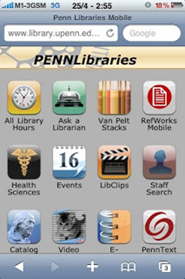 Mobile library websites with an icon-style layout in 2010—North Carolina State University Libraries* and University of Pennsylvania Libraries* |