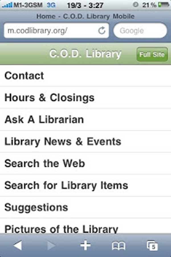 If your library uses the LibGuides system, you may also use LibGuides to create a mobile-friendly version of your library website since the system automatically reformats itself when a user accesses the site on a mobile device. If your library has the staff with knowledge about basic HTML and CSS, mobile frameworks such as iUI or JQuery Mobile can also be used to create a mobile website. Make sure to add a link to your library’s full desktop site in the footer of your mobile website so that library patrons can opt out and use the familiar desktop website instead.