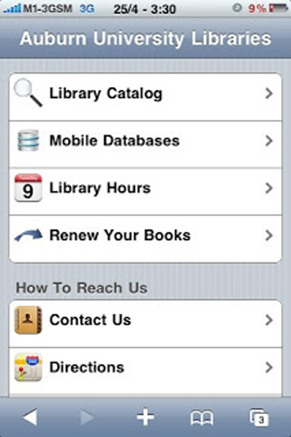 As a matter of fact, a mobile library website was still new in 2010. At that time, Aaron Tay, librarian from the National University of Singapore, noted that the M-Libraries page in the Library Success wiki, which provides the most complete listing of libraries with mobile sites, listed over forty such sites.4 At the time of this writing, the same list includes 130 mobile websites in the section “Mobile Interfaces (and/or OPACS).”5 More and more libraries are offering mobile websites for library patrons. In his blog post, Tay compared all the listed mobile websites as of April 2010 using the Mobile Safari web browser on his iPhone and observed that the mobile library websites showed three different types of layouts: (a) a bare-bones text layout designed primarily for feature phones (see figure 3.3), (b) a list-style layout in multiple rows (see figure 3.4), and (c) a layout with icons similar to the iPhone screen targeting primarily the smartphone (see figure 3.5).6 At that time, the icon-style layout was seen as the most sophisticated kind. But there were still some minimalist mobile websites with the bare-bones text layout designed for the feature phone rather than the smartphone. Most mobile library websites adopted the list-style layout.