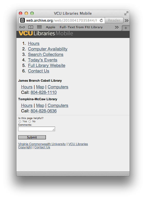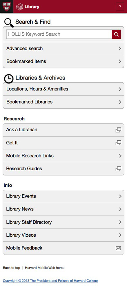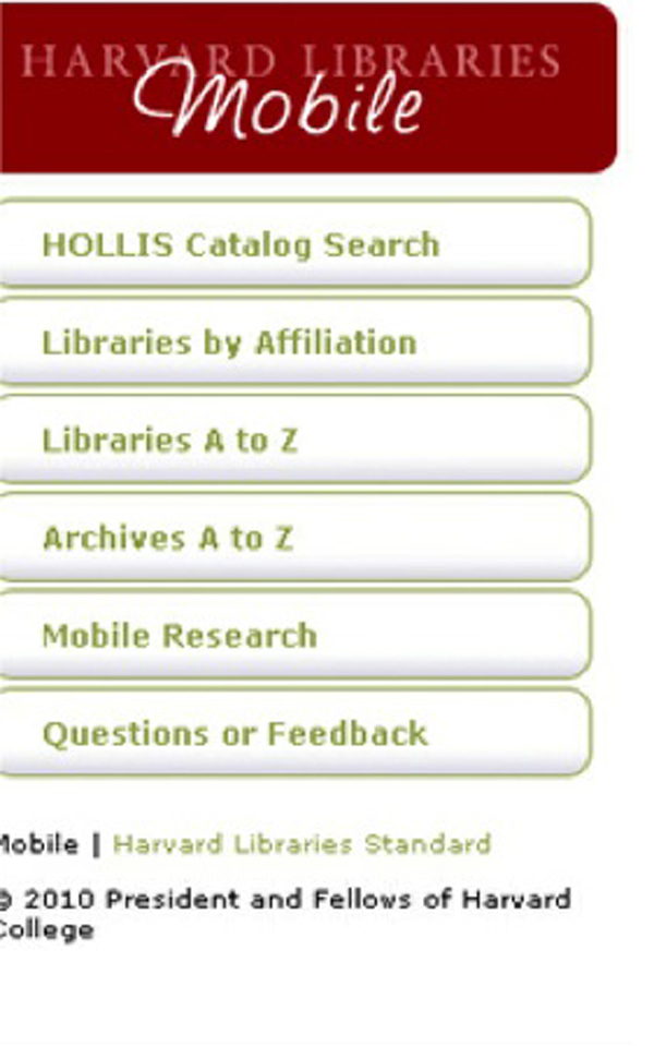 Harvard Libraries mobile website in 2010, 2012, and 2013 [http://m.harvard.edu/libraries] |