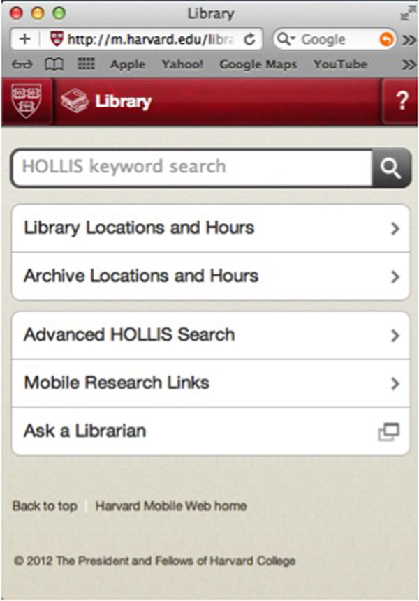 Similarly, the Harvard Libraries mobile website (see figure 3.8) in 2010 already included the “Mobile Research” menu item along with HOLLIS Catalog Search. But the site in 2012 shows the library catalog search box at the top of the mobile website home page. This allows mobile device users to search for an item right away without having to go to the HOLLIS Catalog Search page as they did in the previous version. The current site in 2013 was further expanded with more features that support research activities.