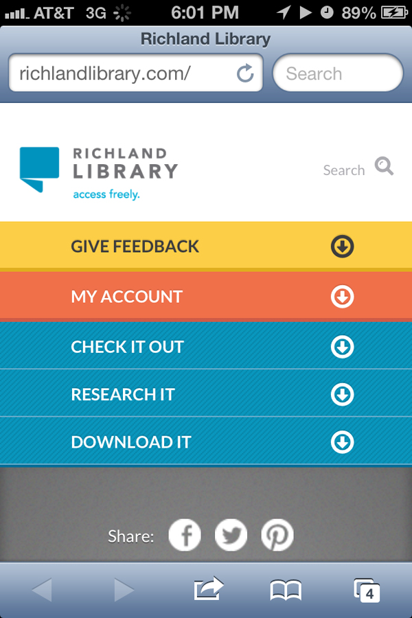 Richland Library’s responsive website on a mobile device screen [http://richlandlibrary.com]. This website prominently features content that library patrons would be interested in interacting with: items people can borrow; databases, magazines, and other resources for research; and items that are downloadable |
