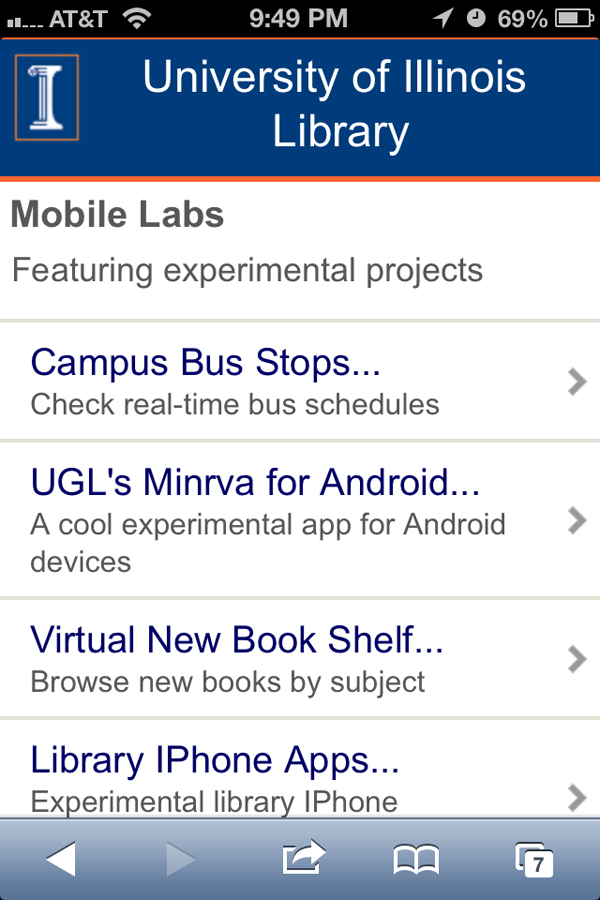 University of Illinois Library mobile website “Mobile Labs” page [http://m.library.illinois.edu/labs.asp] |