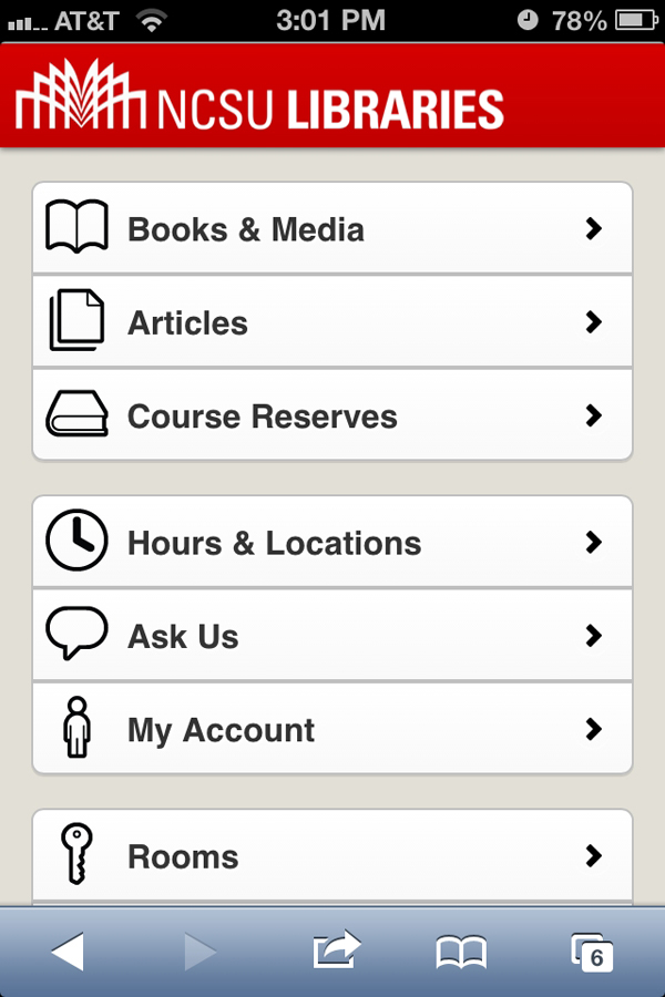 The mostly recently redesigned NCSU Libraries mobile website appears to place great emphasis on study and research. “Books & Media,” “Articles,” and “Course Reserves” are the top menu items. The “Books & Media” page allows users to search the mobile-optimized library catalog. The “Articles” page enables users to search for articles as well as books and journals. This search feature of the NCSU Libraries mobile website uses Summon, a commercial discovery layer product from Serials Solutions, just as the BSU Libraries mobile website does. The “Course Reserves” page allows users to read course readings on their mobile devices.