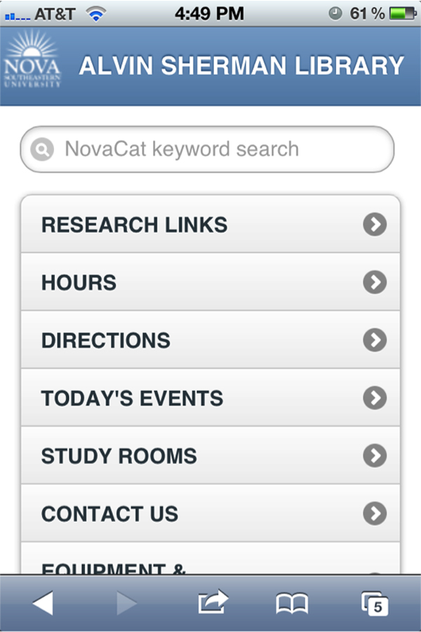 The mobile website of Nova Southeastern University’s Alvin Sherman Library (see figure 3.11) was designed to accommodate feature phone users in 2009.9 Around 2012, it was redesigned to be more smartphone-friendly. As in some of the other mobile library sites that we have seen, this version of mobile website included a library catalog search box at the top of the home page. In addition, the mobile site also placed “Research Links” as the first menu item on the home page. Having the catalog search box and “Research Links” as the first two items on the home page menu screen signifies that the library now expects patrons to use these features more than any other information, such as hours or directions.