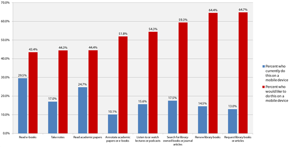 Just three years later, in 2011, MIT Libraries conducted another library survey. This time, the survey was given to 16,070 library patrons. One of the survey questions asked which of the following activities patrons would like to be able to do with a mobile device: read academic papers, read e-books, take notes, annotate academic papers or e-books, search for a library-owned book or journal article, renew library books, request library books or articles, listen to or watch lectures or podcasts. This question was answered by 7,020 patrons, a response rate of 43.7 percent.15 The results shown in figure 3.15 exemplify the dramatic change that took place in library patrons’ expectations about library collections and services. From 10 to 29.5 percent of respondents indicated that they currently perform the tasks listed on a mobile device, and almost half or more responded that they would like to perform all those tasks on a mobile device.16