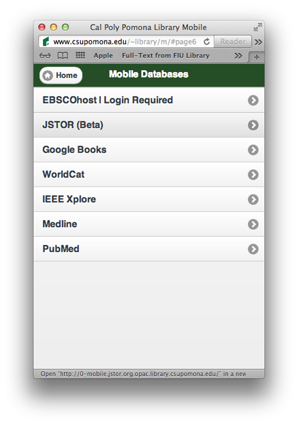 Cal Poly Pomona University Library mobile website in 2010*, 2012, and 2013 and the current Research, Mobile Databases, and Find Books & Articles pages [www.csupomona.edu/∼library/m/] |