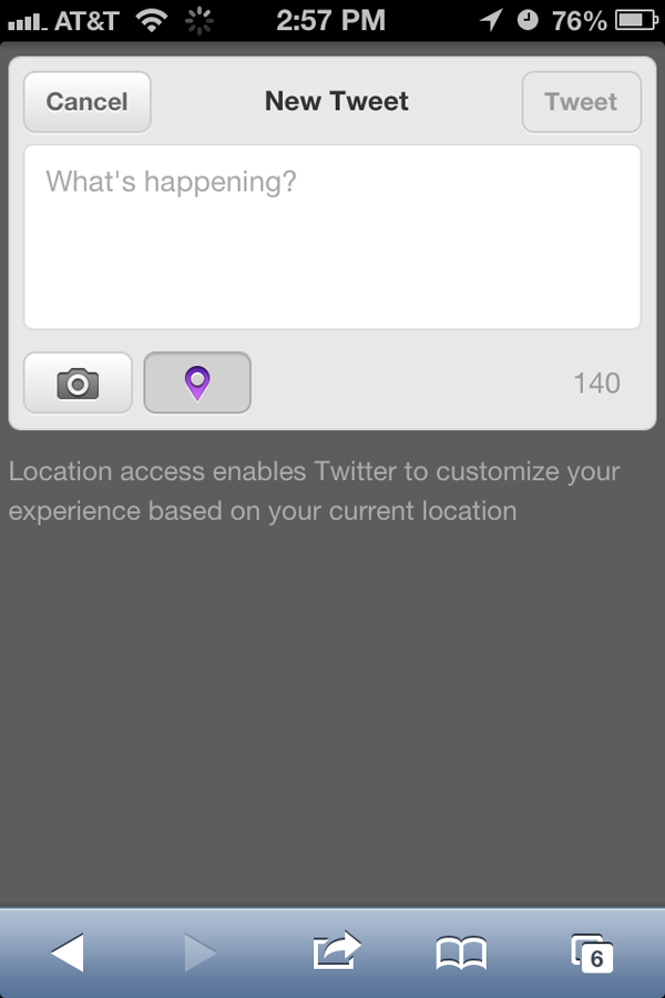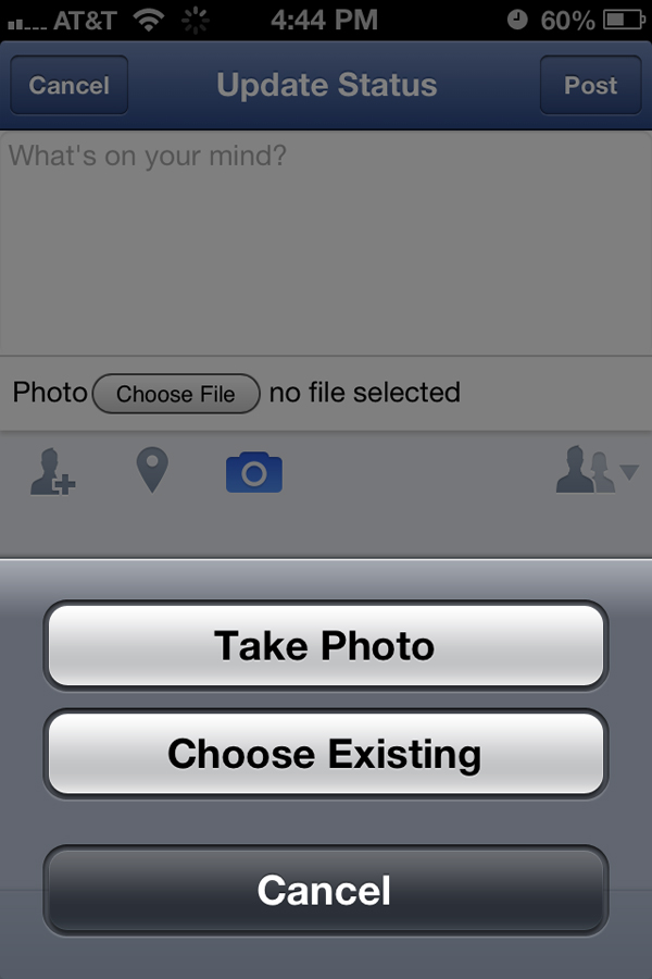 Furthermore, in terms of accessing device hardware and file systems, mobile web browsers are making progress in a way that will eventually make web apps comparable to native apps. Device/media APIs, file system APIs, and audio APIs are being either drafted or planned.18 Some of the features are already available in mobile web browsers. For example, Twitter (see figure 2.4) and Facebook (see figure 2.5) now allow users to upload photos and tag their locations inside a mobile web browser if their mobile device runs either Apple’s iOS 6 or the Android 4.x operating system.19 Once mobile web browsers become more capable and mobile network speed and mobile device battery life improve, web apps will be able to compete almost equally with native apps.