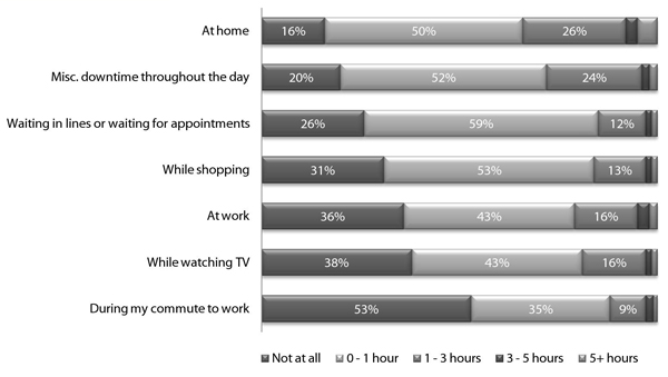 Results of a survey by Compete.com about how much time, throughout a typical day, people spend using their mobile devices [Source: Danielle Bulger, “Smartphone Owners: A Ready and Willing Audience,” Compete Pulse blog, March 12, 2010, http://blog.compete.com/2010/03/12/smartphone-owners-a-ready-and-willing-audience] |