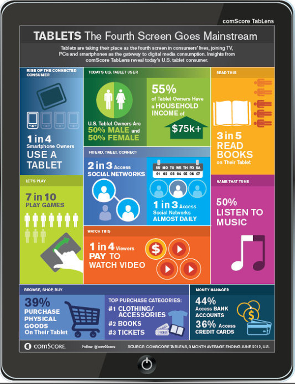 People’s activities on the tablet [Source: “comScore TabLens: Today’s U.S. Tablet Owner Revealed,” comScore, accessed March 21, 2013, www.comscore.com/Insights/Press_Releases/2012/8/comScore_TabLens-Today_s_US_Tablet_Owner_Revealed] |