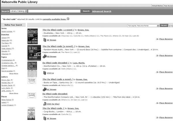 Results from the Koha implementation at the Nelsonville Public Library, showing relevancy sorting and faceted navigation. |