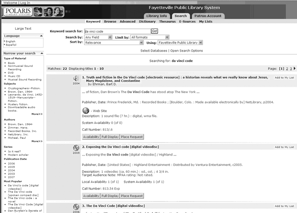 The online catalog of Polaris has gained a number of features in its latest release that include some of the characteristics of the next-generation library interfaces. Beginning with Polaris Version 3.3, the online catalog includes relevancy ranking, faceted navigation, and a “did you mean” feature for spelling suggestions in queries. This version also uses AJAX to improve the function of its user interface. Polaris has supported the display of cover art images and other enriched content.2