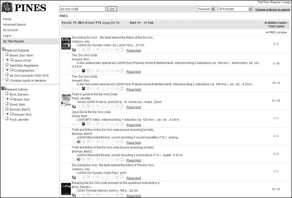 When the user enters a query into the PINES catalog, it returns the results in a wide column with a narrow column on the left side of the page for search navigation. This column includes multiple sections titled “Relevant Subjects,” “Relevant Authors,” and “Relevant Series,” each listing the most relevant terms culled from the current results. Clicking on one of these executes a new search for the term. This feature differs from faceted browsing, which limits the current search with the selected term.