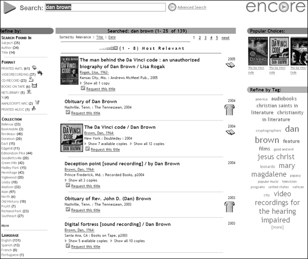 When displaying search results, Encore divides its interface into three columns. A wide column in the middle displays the results gathered so far. A narrow column on the left provides links for faceted navigation. A narrow column on the right provides additional features, such as highlighting featured resources, a tag cloud, and federated-search results (see figure 8).