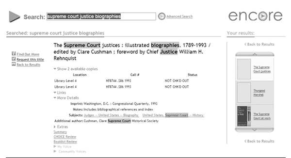 Encore has provisions for social networking features that were not yet in place in the preview version. The full-record view includes sections labeled “My Voice” and “Community Voices,” which were grayed out on the prerelease versions examined for this report. Once activated, these sections will allow users to contribute comments and reviews.