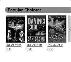 As Encore displays search results, it presents selected items in the upper right corner in a box labeled “Popular Choices.” This feature initially displays three items calculated to be of strongest interest, with navigational bars with arrows that can be used to scroll through additional items.