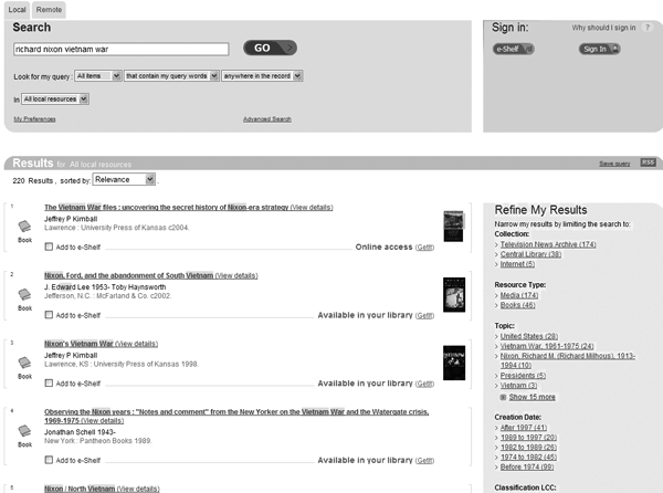 By default, a query executes against the local index. The user can select the Remote tab to view the results of the same query against remote resources. The specific resources searched through the Remote tab are selected by the library and relate to the configuration of the MetaLib federated-search utility. A default set of resources will be addressed in the Remote tab for users who are not signed in. The library can define discipline-specific sets of resources in MetaLib, which can be activated for search in the Remote tab of Primo by setting user preferences.