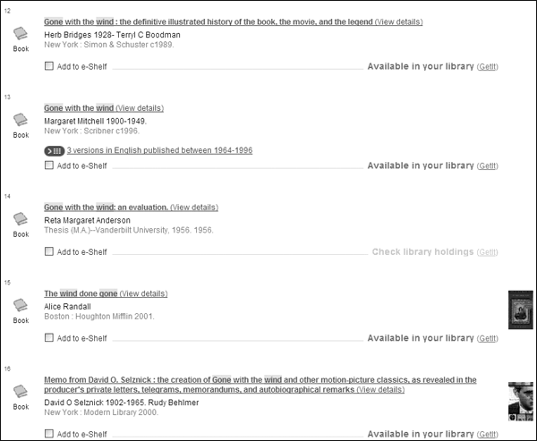 The initial results present a brief view of the items returned by the query. The brief view includes a number of features associated with the item. An icon on the far left side indicates the type of item, such as book, video, or journal. The brief view also presents some basic descriptive information about the item, including its title, author, and publication data. A View Details link launches the full view of the record. Below the descriptive information appears a check box for adding the item to the personal e-shelf, a utility for storing and managing items of interest.