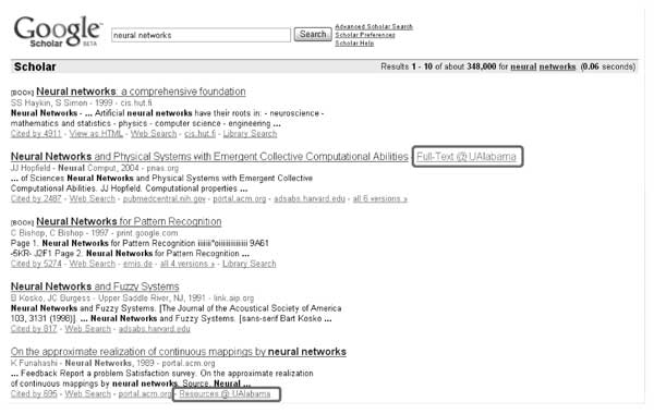 In other words, Google uses the holdings information to create a larger and more prominent link next to the title of the citation in the interface to make it more clear to users that Google has identified their institutions as having the right to access the full text (see figure 5 on p. 40). If Google cannot identify that a user has full-text rights, then the OpenURL link appears down in the fray with the other possible links to resources, such as the National Institutes of Health or a generic Web search (in Google, of course).