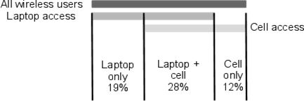 Comparison of wireless access via laptops and cell phones. Source: Aaron Smith, Mobile Access 2010 (Washington, DC: Pew Internet & American Life Project, 2010), www.pewinternet.org/Reports/2010/Mobile-Access-2010.aspx. |
