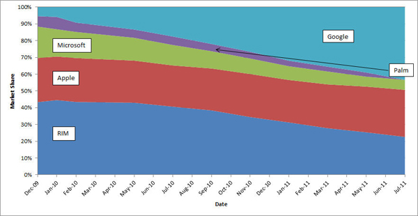 Market share by OS. Data for May 2010 does not include Apple's iPhone launch. As of July 2011, Palm data was no longer reported. Source: comScore data on smartphone platforms from news releases on U.S. mobile subscriber market share dated from Feb. 2010 through Aug. 2011; available at www.comscore.com/Press_Events/Press_Releases?year=225&keywords=%22u.s.+mobile+subscriber+market+share%22&location=0&searchBtn=Search. |