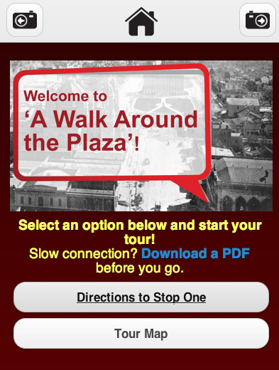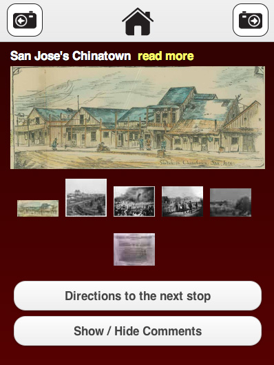 Stops on a tour include historic photos, Read More links, and (not shown) directions to the next stop. |