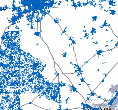 Broadband coverage, all types of broadband. The heavily connected circle in the top left is San Antonio; Corpus Christi is in the lower right. Coastal Bend's service area is along, and south of, Interstate 37 (the grey line roughly through the center of this image). Source: National Broadband Map, www.broadbandmap.gov/technology. |
