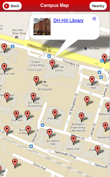 Integration with Google Maps shows points of interest on campus, with links to additional content. |