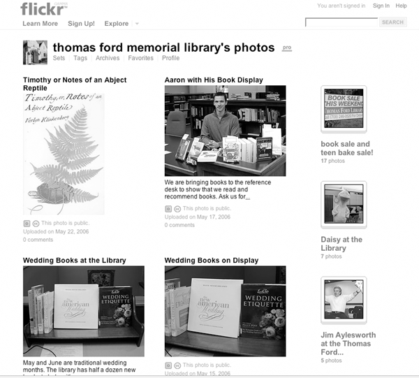 Another benefit of using Flickr and tagging photos with your library's name and location—it gets you found in the great pool of all of the photos in Flickr. Maybe someone is searching Flickr for his or her hometown, discovers images of the local library, and learns of services or programs this individual didn't know about? Participating in this type of social-software community is relatively inexpensive, can offer presence, and it's fun! Other features: