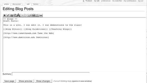 Once configured or installed, a wiki is edited by a simple set of commands in a Web interface that is strikingly similar to that of a blog; however, wikis employ different tag commands. Mediawiki, for example, an open-source software option, uses straight brackets to create hyperlinks and other pages (see figure 18).