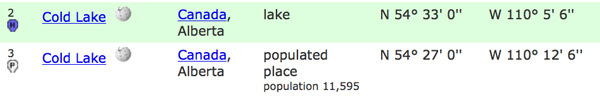 An example from GeoNames showing the distinction between a city and a lake with the same name. |