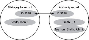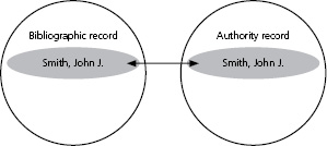 When bibliographic and authority records are connected through the use of text strings, (Figure 10) any change in the display form of the heading causes the link between the two records to break. (Figure 11). Using a non-display identifier (Figure 12) allows the connection between the bibliographic and authority data to be maintained even though display forms may change. This method also allows the use of alternative displays, such as in different languages or scripts, without the need to make modifications to the bibliographic record.
