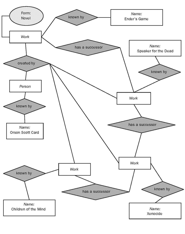 Another example of a bibliographic relationship is pertinent to conceptual rather than structural relationships—that of the retelling of the same story, such as the relationship between Shakespeare's Romeo and Juliet and the modern urban rendition in West Side Story. These relationships are known and commonly analyzed in reviews and critical works, but bibliographic metadata has no vocabulary to express them. The relationships may be noted in bibliographic records, but as nonspecific references in added entries or as notes intended solely for human readers. As part of an ER model, relationships are made explicit, as we will see further on.