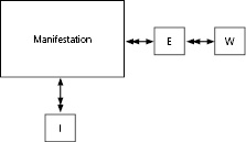 This style of diagram makes it easier to see the relationships, and it also makes it easier to visualize a variety of cases. One aspect of FRBR as it is described and diagrammed is that it gives the impression of being a linear, hierarchical model from Work to Item. This is not the viewpoint of library cataloging, which has necessarily at its center a Manifestation. Without disturbing the meaning of FRBR, we can visualize it with the manifestation as the focus (see figure 11).